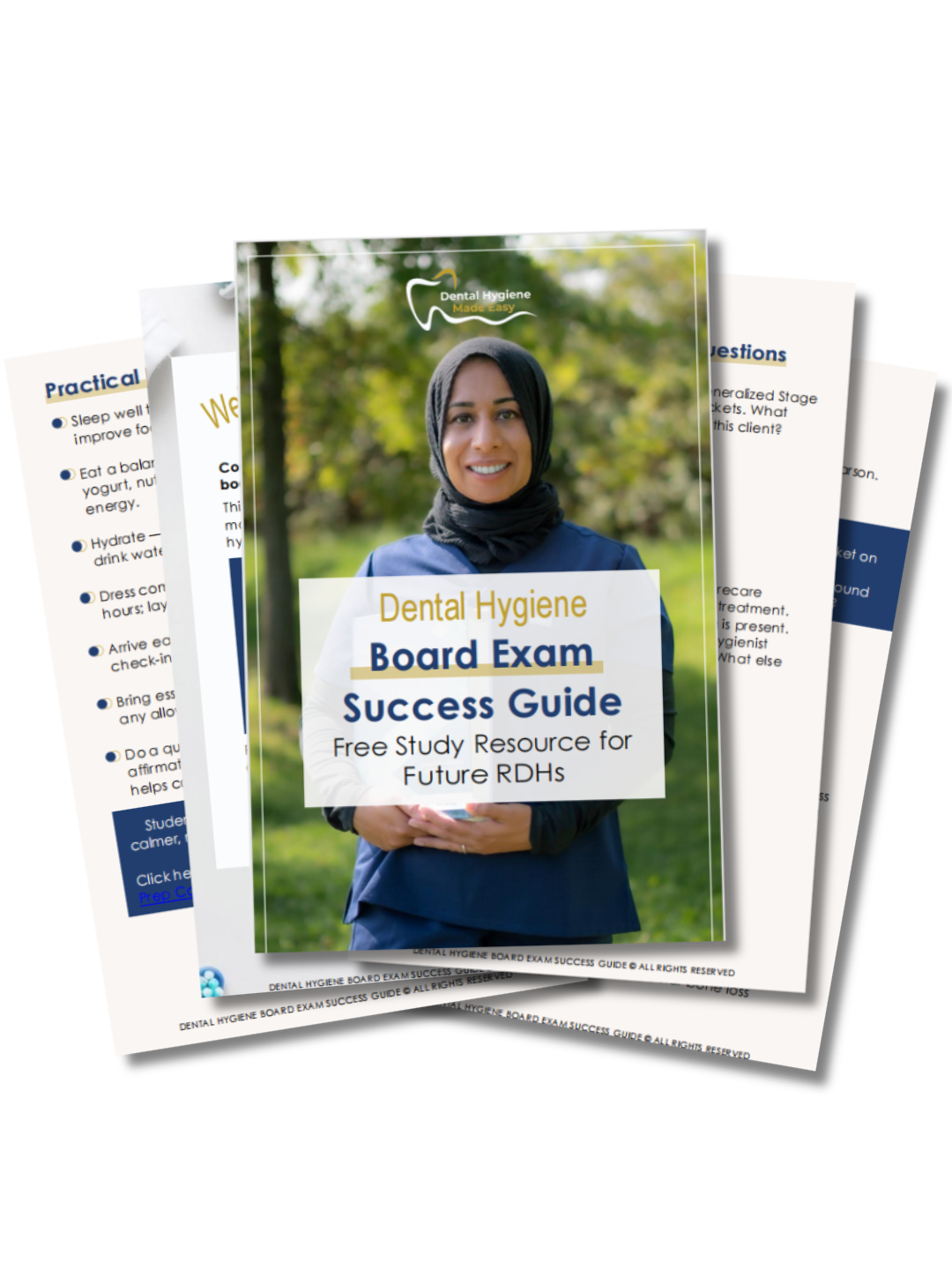 Download theĀ FREE Dental Hygiene Board Exam Success Guide with Sample Board Exam Questions