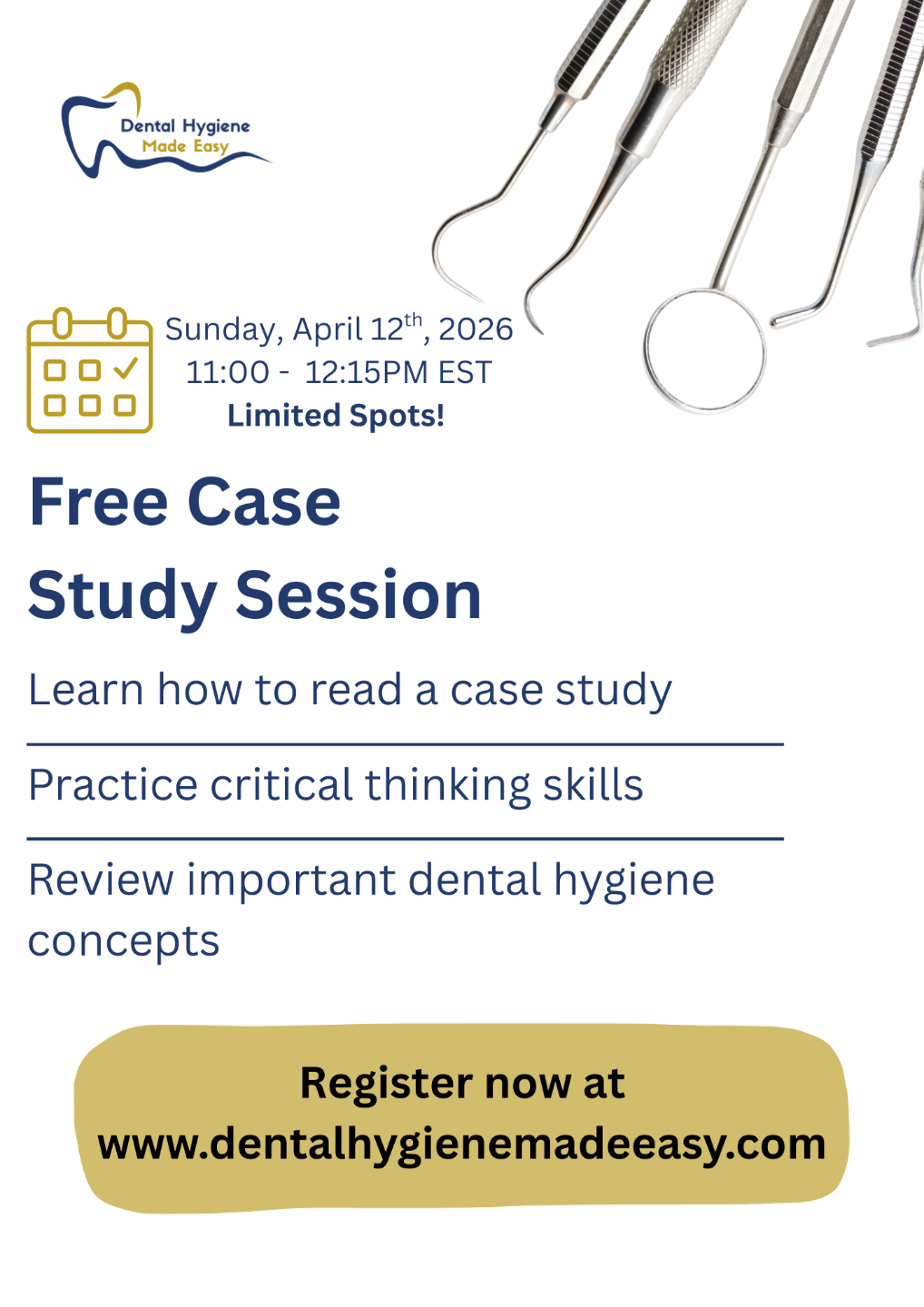 Sign up for our FREE dental hygiene case study class and get a taste of how we break down board-style questions step by step. In this session, you’ll practice clinical reasoning, review key concepts tested on the board exam, and learn strategies to approach case-based questions with confidence. It’s a great opportunity to experience our teaching style, strengthen your knowledge, and get one step closer to passing your board exam. Reserve your spot today! 🦷